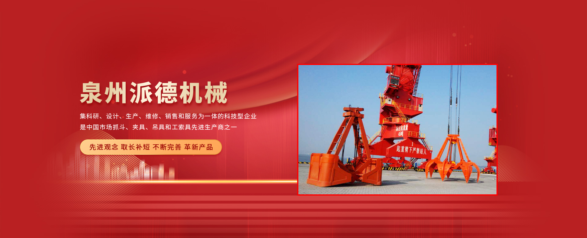 泉州派德機械有限公司成立于2012年5月,位于全國文明的古城福建泉州,公司擁有各類型專業(yè)員工82人,其中高級工程師1人,工程師4人,助理工程師5人,是一家集科研、設計、生產(chǎn)、維修、銷售和服務為一體的科技型企業(yè),是中國市場抓斗、夾具、吊具和工索具先進生產(chǎn)商之一。產(chǎn)品采用國內外先進的設計方案、技術規(guī)范、制造過程、工藝流程和服務,憑借在抓斗、夾具、吊具和工索具領域的超前設計理念和成熟的技術、工藝和管理,在抓具領域迅速崛起。